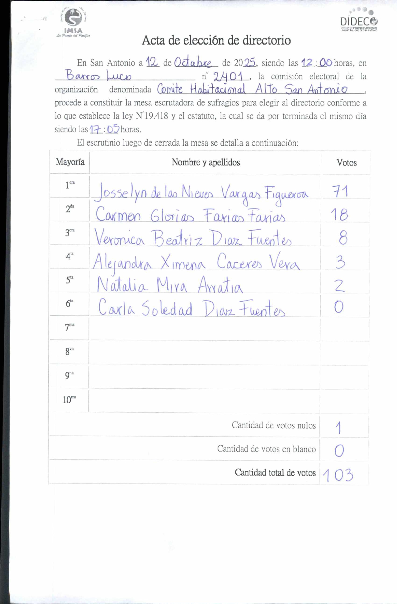 Acta de elecciones COMITE HABITACIONAL ALTO SAN ANTONIO