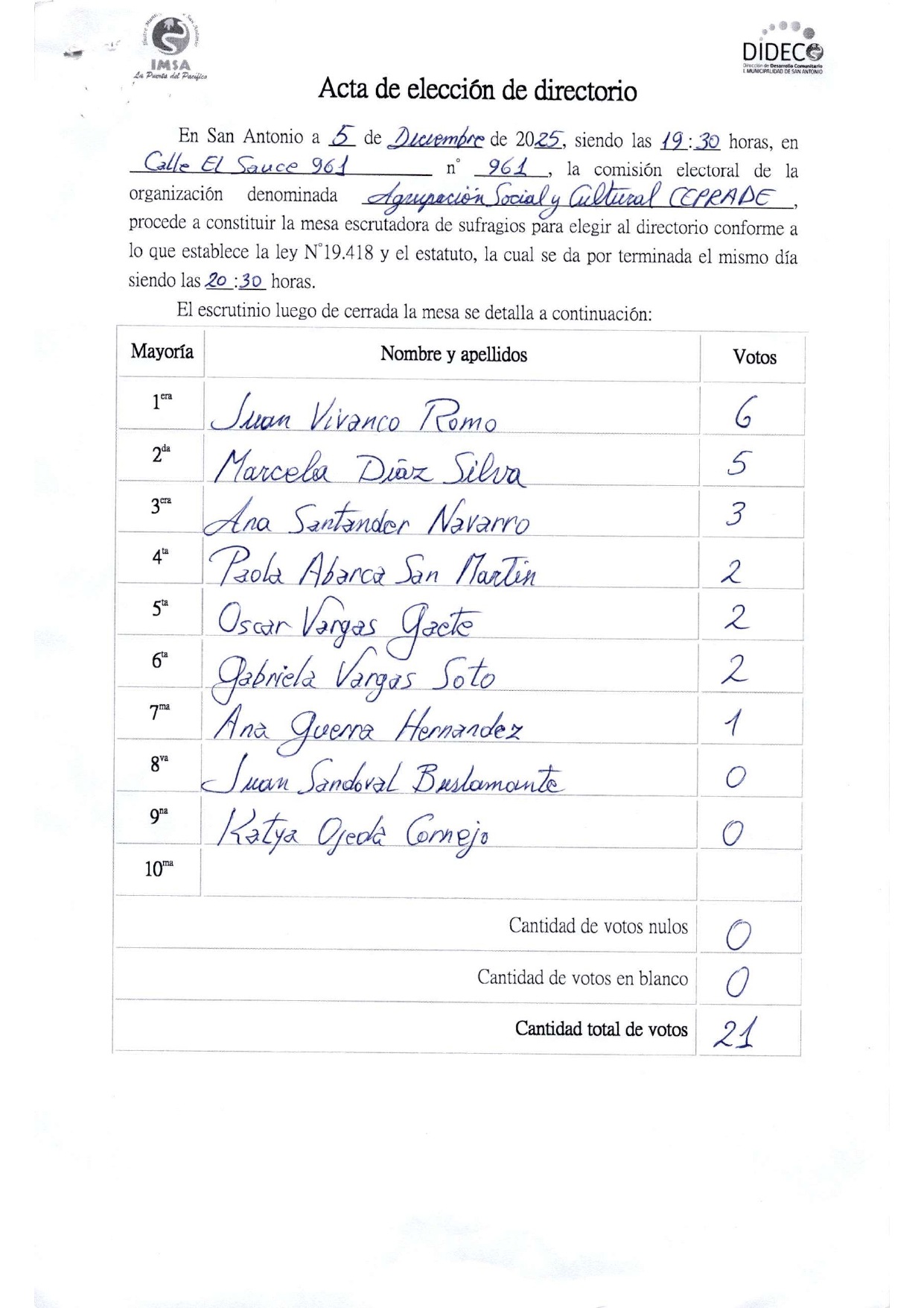 Acta de elecciones AGRUPACION SOCIAL Y CULTURAL CEPRADE
